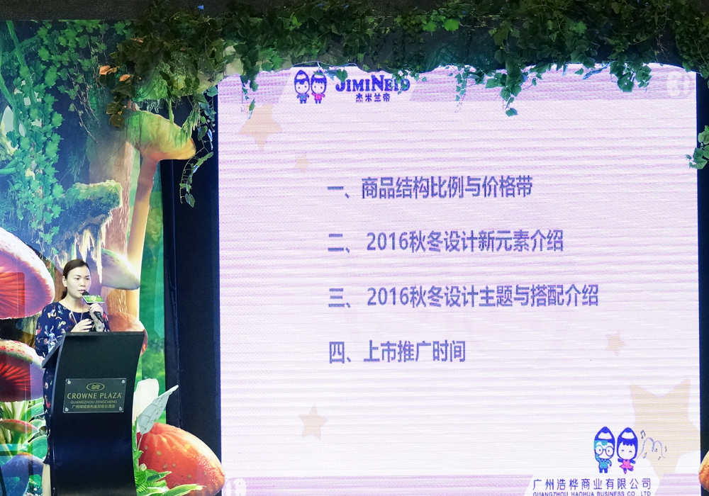 杰米蘭帝董事長李彩霞從四個方面為秋冬商品開發(fā)了進行了講解:一、產(chǎn)品結構與價格帶,針對秋季與冬季的兩個季度進行的價格帶分析,劃分為主銷基本款、推廣款、形象款的產(chǎn)品體系定位;二、2016秋冬設計新元素介紹,針對于功能性穿著方式,面料上采用多種工藝進行更多新元素的注入;三、2016年秋冬設計主題與搭配設計,從自然成長營、夢·迪士尼、新貴領袖等三個系列突出產(chǎn)品貼切生活實用性;四、上市推廣時間,根據(jù)于季度時令進行分批的上市規(guī)劃,在每一階段都有新的產(chǎn)品涌入市場。