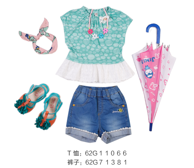 蝙蝠袖T恤+牛仔短褲+個性涼鞋+蝴蝶發(fā)箍+JIMINEID傘