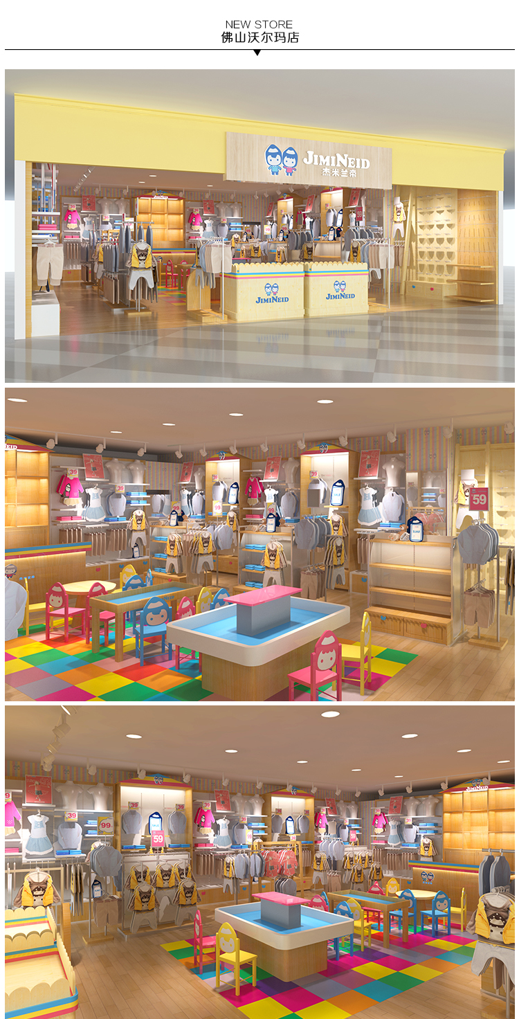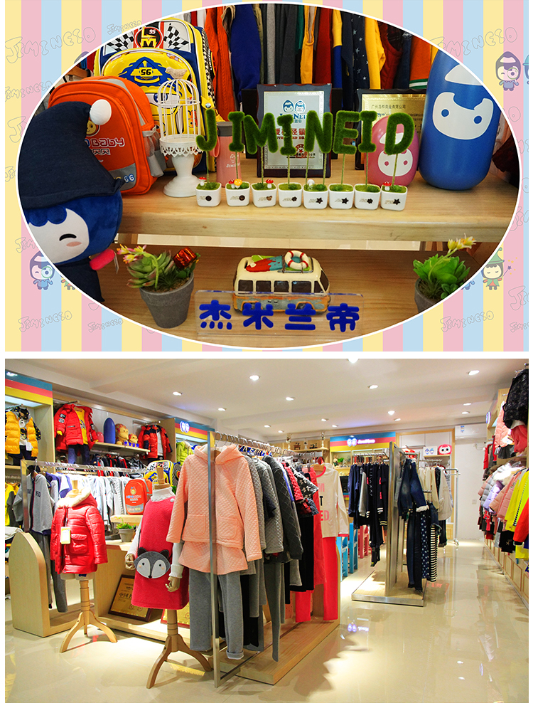 “杰米蘭帝/JIMINEID”快時尚童裝品牌較其他童裝品牌裝修特點:獨特的建筑裝修,色彩亮麗吸人眼球、布置有序、營造兒童嚴重的夢幻世界,杰米蘭帝童裝全新形象設計的專賣場內(nèi)設游樂區(qū)哦,為孩子們提供最歡樂的趣事場地,讓粑粑麻麻們放心購物還能和孩子們來場親密的親子互動,讓孩子們的童年充滿樂趣!