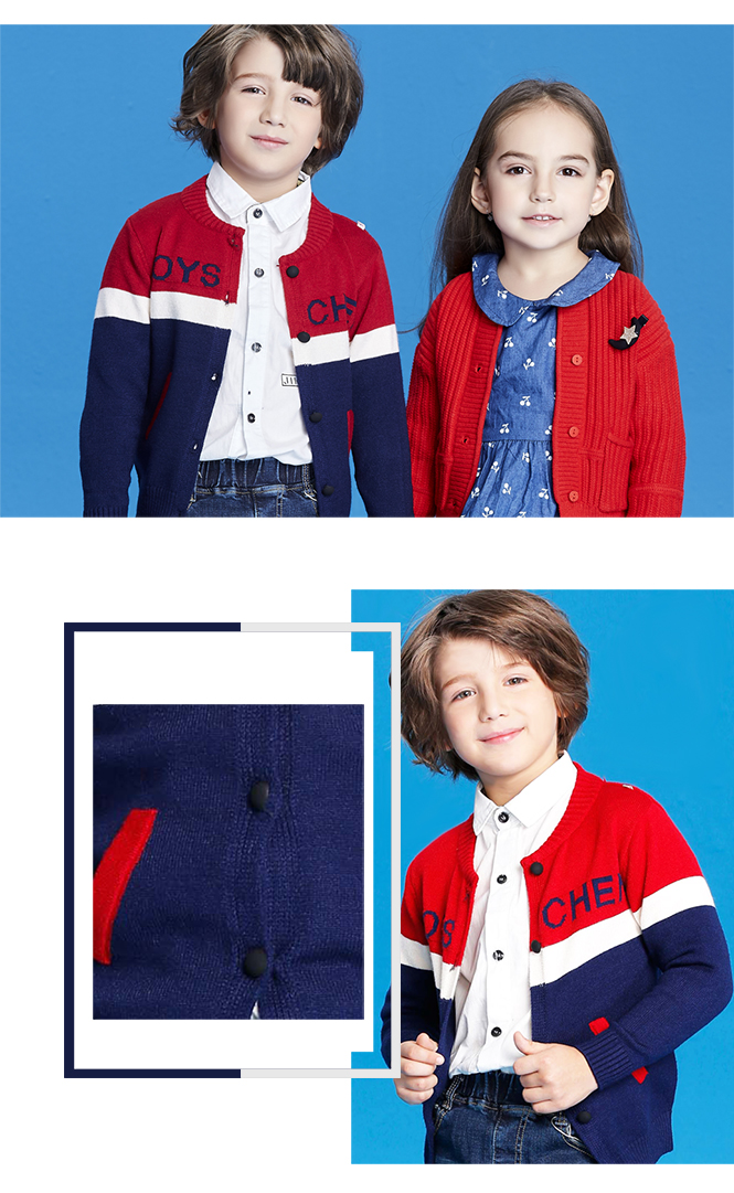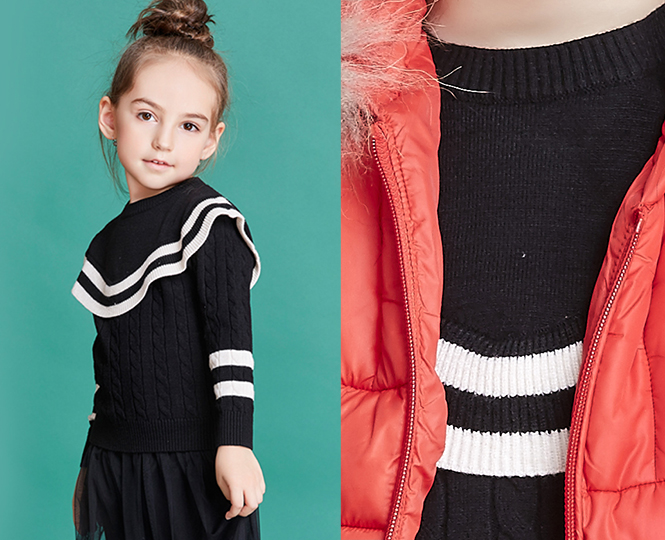 黑色毛衣和其他的外套搭配在一起永遠不會出錯,黑色十分低調(diào),經(jīng)典搭配簡約時尚!當 低調(diào)的黑色條紋毛衣遇上紅色羽絨服外套的時候, 突破了單色的單調(diào),讓您的孩子在人群中脫穎而出,成為其他人眼中的焦點。