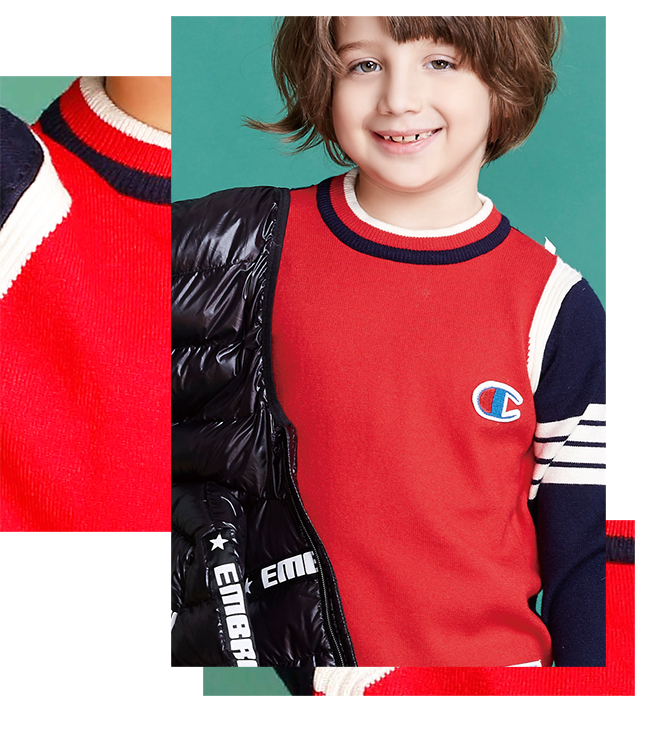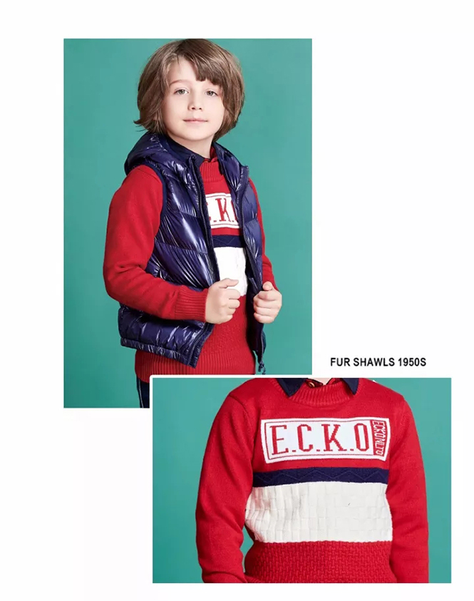 圓領(lǐng)毛衣,搭配桔紅色外套,就像夏天的陽光,讓孩子們可以在冬天,享受著夏天的溫暖。