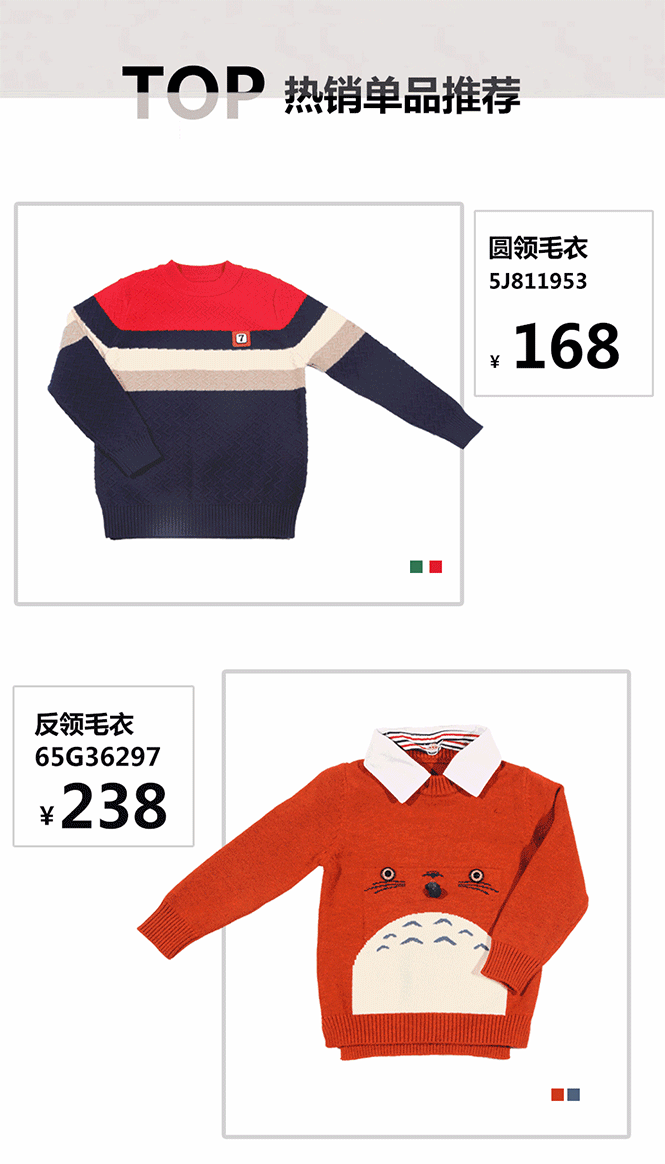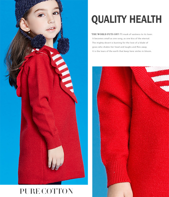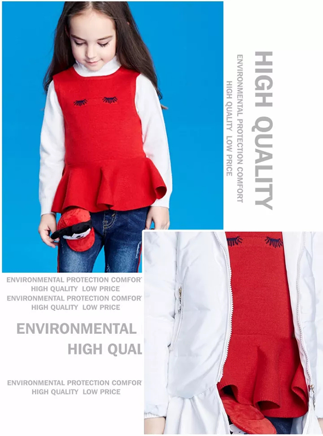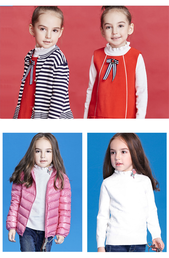 高領(lǐng)毛衣,可以拉伸臉型比例,更適合脖子長長的小女孩!搭配牛仔喇叭褲,活潑靈動,有一種走路爆棚的氣場。衣角采用以紅色為主色,不管配以純潔的白色還是可愛的粉紅色外套,都能夠脫穎而出。