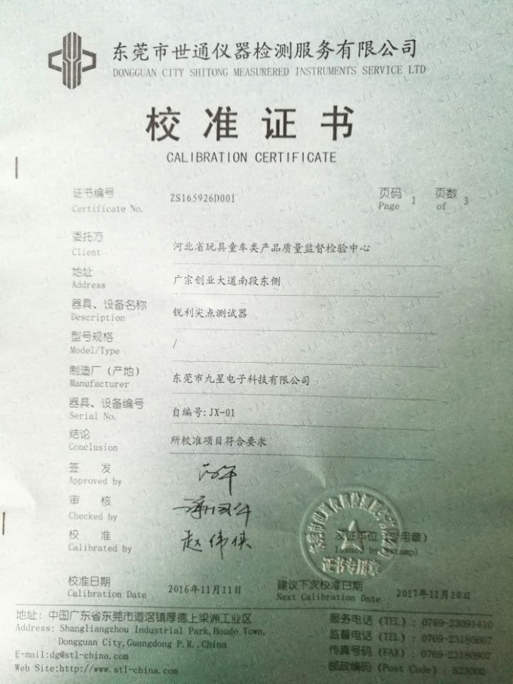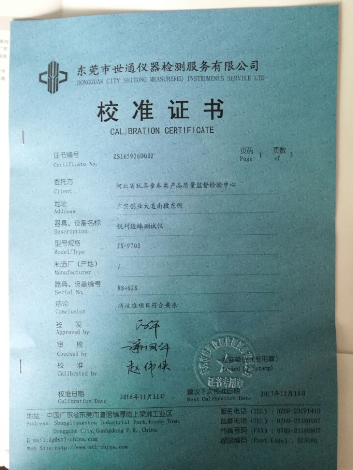 近日,河北省玩具童車類產品質量監(jiān)督檢驗中心訂購我司銳利邊緣測試儀\銳利尖點測試儀等設備,并維托我司送計量,謝謝貴單位對我司的信任與支持;